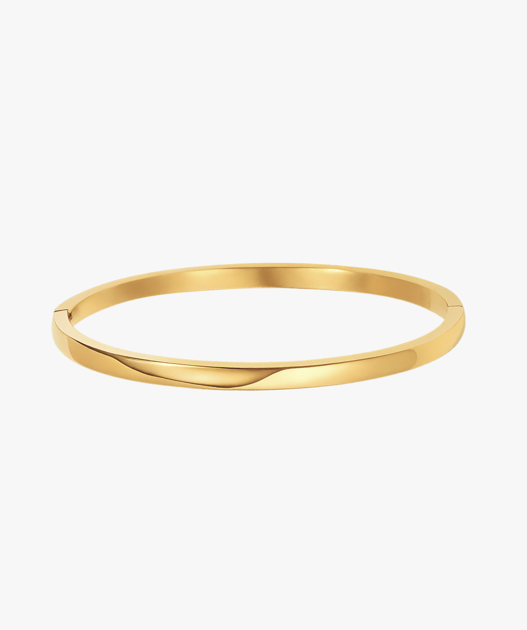 The Mina Bangle Bracelet is made of 18k gold plated stainless steel. The bracelet has a snap closure and is one size. The finish is smooth and round.